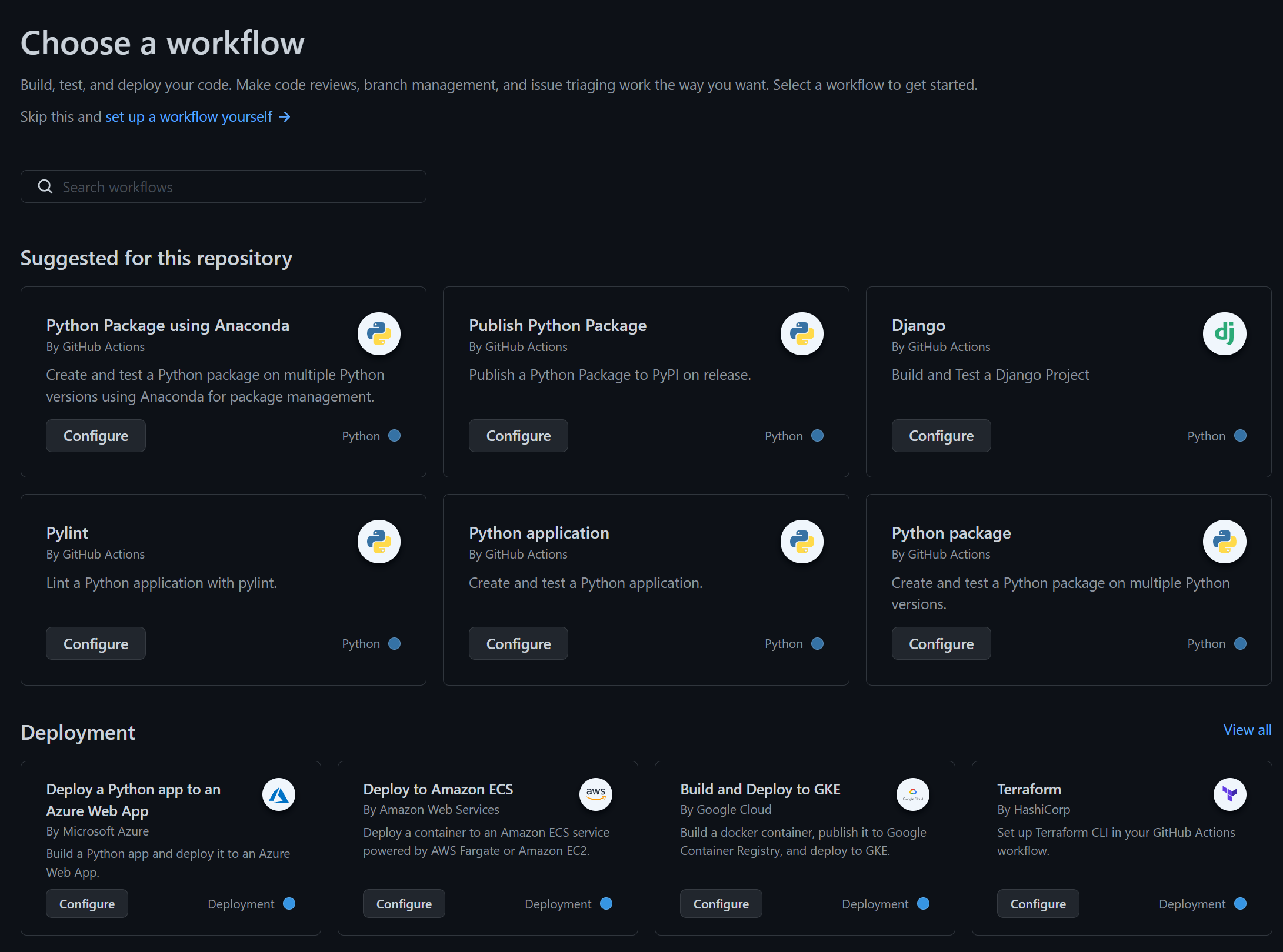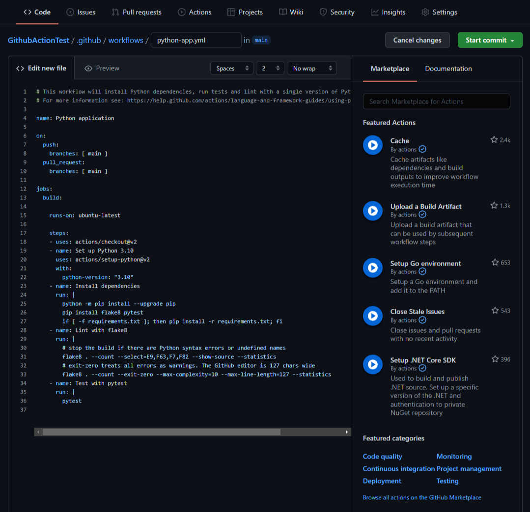 이게 돌아가는 방식은 python-app.yml이라는 .github/workflows/ 디렉토리 내의 파일을 통해 수행되는 것이다. 기본적인 사용방법은 굳이 하나하나 설명하지 말고 직접 사용해보는 것이 이해가 훨씬 빠르다. 이 yml 파일을 처음 부터 작성할 필요 없다. 이미 수많은 개발자들이 자기 입맛에 맞게 템플릿을 작성해놨다. 이걸 가져다 쓰는 건 검색해서 쓰면 된다.