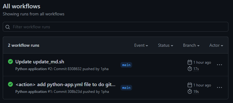 앞으로 main branch에 push할 때마다 위에 있는 Github Action이 위잉 돌아갈 것이다. 여태까지 돌아간 workflows들을 확인하고 싶으면 다시 Actions 탭을 누른다.