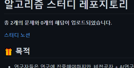 그래서 애초에 서로 모르는 사람들 끌어다가 스터디를 만들었다. 문제를 풀면 솔루션을 레포에 올리기로 했는데 우리가 총 몇 개의 문제랑 몇 개의 솔루션을 올렸는지 대문에 써놓으면 더 열심히할 것 같아서 시작하게 되었다.